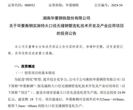 根据公告,特大口径无缝钢管连轧技术开发及产业应用项目总投资24.99亿元,建设期18个月。项目将建设年生产80万吨特大口径热轧无缝钢管全套机组,并通过数字化、智能化技术,打造智能制造标杆。此举有利于该公司强化钢管及深加工产业链,支持打造湖南省先 进制造业集群。