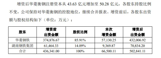 同日,华菱钢铁公告称,为支持子公司衡钢实施上述项目,公司及湖南钢铁集团拟向衡钢同比例增资10亿元。其中,湖南钢铁集团出资1.409亿元,华菱钢铁出资8.591亿元。