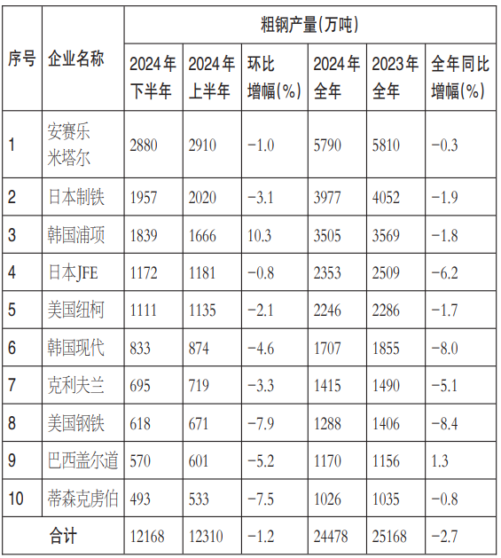 第 一,粗钢生产下降。2024年,10家国外企业合计粗钢产量为24478万吨,同比下降2.7%。分企业看,只有巴西盖尔道粗钢产量同比小幅增长,主要原因在于市场需求增长、生产效率提升。下半年,国外企业中只有韩国浦项粗钢产量环比增长,其余企业均环比下降。总体看,国外企业基本呈现出下半年产量环比下降、全年产量同比下降的态势。具体各企业粗钢产量情况见下表: