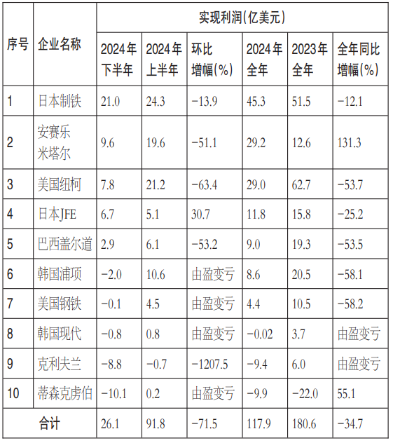 第三,盈利状况下滑,但盈利水平仍相对较高。2024年,10家国外企业合计实现利润117.9亿美元,同比下降34.7%。分企业看,在10家国外企业中,只有安赛乐米塔尔和蒂森克虏伯利润同比增长,其余8家企业同比均大幅下降。日本制铁2024年盈利状况非常突出,通过关闭高炉、减少供给来压缩固定成本,并提高面向车企等大客户的销售价格;主动调整经营结构,大幅度增加电工钢产量;退出与宝钢股份的合资业务,把经营资源集中至美国、印度和东南亚市场;积极拓展海外原料市场,提高原材料自给率。通过这些调整,日本制铁2024年上半年、下半年、全年实现利润均排名第 一位,且保持非常大的优势。具体各企业实现利润情况见下表: