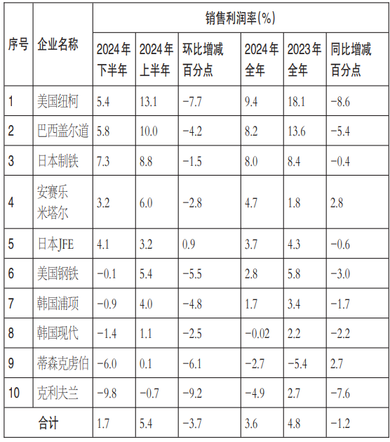 2024年,10家国外企业平均销售利润率为3.6%,同比下降1.2个百分点。分企业看,美国纽柯、巴西盖尔道和日本制铁销售利润率分别达到9.4%、8.2%和8.0%,领 先于其他钢铁企业,也是仅有的3家利润率超过8%的企业;安赛乐米塔尔、日本JFE和美国钢铁的利润率在2.5%以上,也处于较好的水平;韩国的2家企业盈利水平相对较低,韩国浦项全年利润率仅为1.7%,下半年出现亏损,韩国现代下半年同样亏损,全年处于盈亏边缘。总体看,2024年,欧美企业盈利水平最高,日本企业其次,韩国企业相对较低。反观国内情况,据国家统计局数据,2024年黑色金属冶炼和压延加工业销售利润率仅为0.36%,亏损面达31%。据中国钢铁工业协会数据,2024年会员钢铁企业销售利润率为0.73%,亏损面达39%。由此可见,虽然全球钢铁行业都在经历寒冬,但国外钢铁企业盈利能力相比国内企业仍有明显优势。具体各企业销售利润率情况见下表: