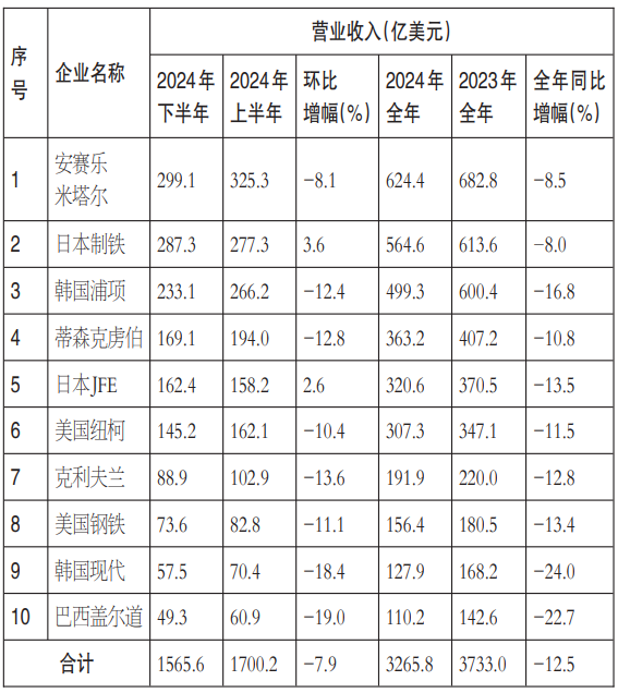 第二,营业收入下降。据英国商品研究所公布的数据,2024年全年,国际钢材价格指数(CRU)平均值为197.5点,同比下降22.5点,降幅为10.21%。分地区看,北美市场与欧洲市场价格指数差距较小,均明显高于亚洲市场价格指数。从同比看,北美指数同比下降8.87%,欧洲指数同比下降10.20%,亚洲指数同比下降11.27%。从半年环比看,下半年全球指数环比下降12.88%,其中北美指数下降18.19%、欧洲指数下降9.41%、亚洲指数下降10.89%。受产量下降和价格下降的双重影响,国外钢铁企业营业收入环比、同比均明显下降。2024年,10家国外企业合计营业收入为3265.8亿美元,同比下降12.5%。其中2024年下半年,国外企业合计营业收入为1565.6亿美元,环比下降7.9%。分企业看,10家国外企业2024年营业收入均同比下降,其中8家降幅在10%以上。具体各企业实现营业收入情况见下表: