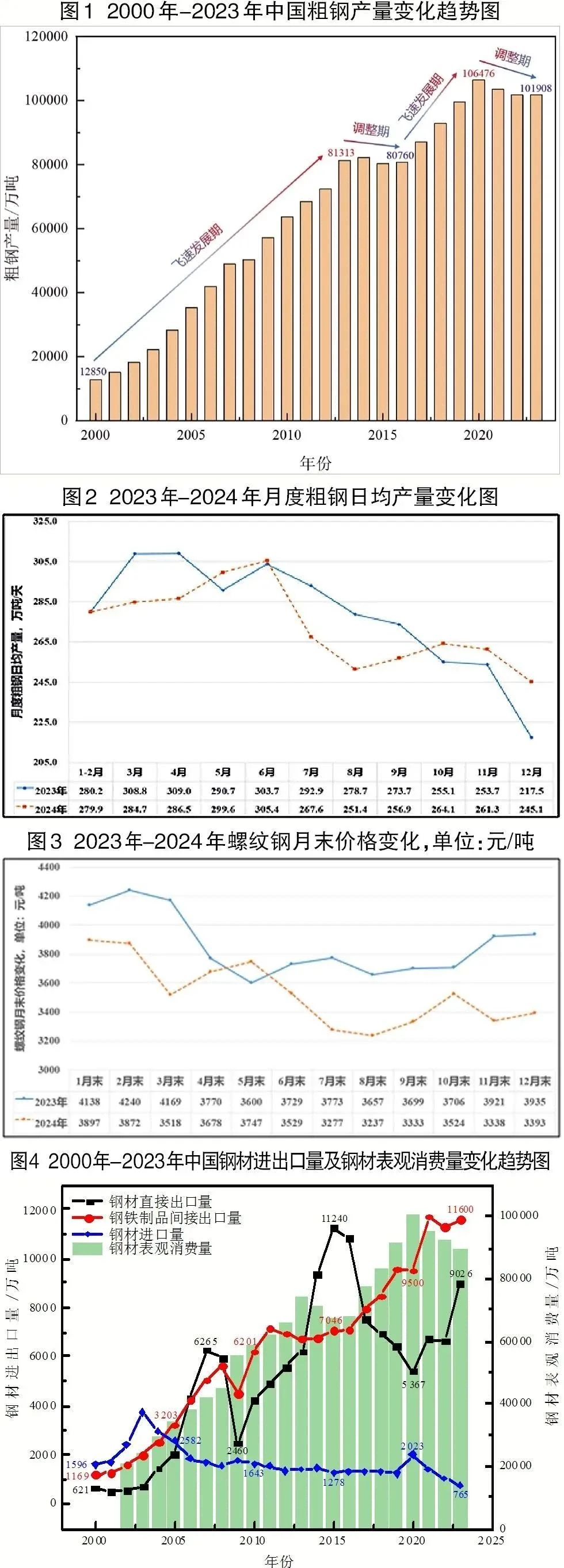 综合分析新世纪以来我国钢铁行业粗钢年产量、近两年粗钢月度日均产量、月末螺纹钢价格以及钢材直接出口量、钢铁制品间接出口量等数据的变化(图1~图4),初步判断目前我国粗钢产量总体呈现供大于求的态势,我国钢铁行业已经进入减量化波动下行阶段,但这个波动下行的周期与幅度还有待进一步观察,下文将对未来我国粗钢产量的变化趋势进行预测和探讨。