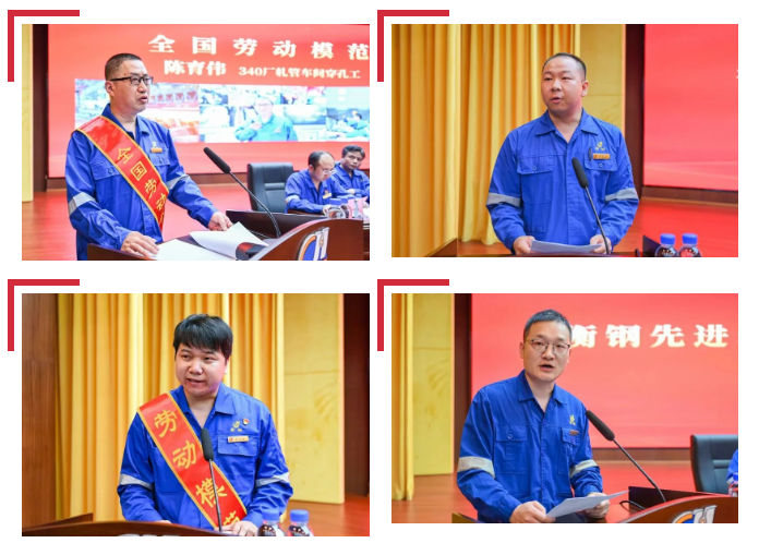 全国劳动模范陈育伟、炼钢厂冶炼二车间精炼炉甲班班长尹学杰、340厂轧管车间主任曹成思和技术中心IPD经理左国锋作为先进代表发言,表示荣誉既是鼓励更是鞭策,要持续弘扬爱岗敬业、争创一流的企业精神,用匠心铸就精 品,用品质赢得市场。